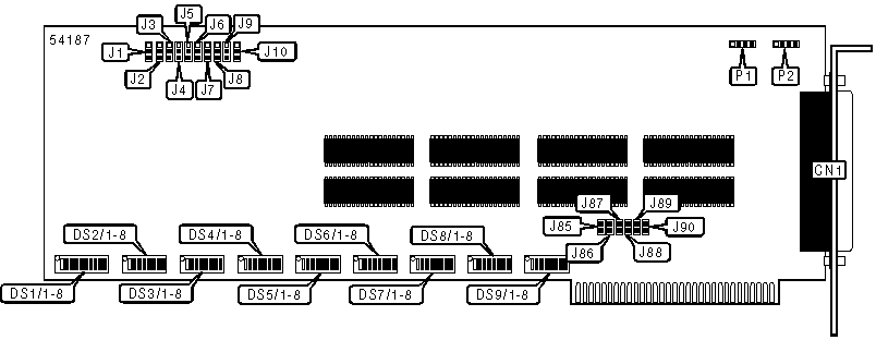 Note: A total of 128 base address settings are available. The switches are a binary representation of the decimal memory addresses. DS9/1 is the Most Significant Bit and switch DS9/7 is the Least Significant Bit. The switches have the following decimal values:DS9/1=512, DS9/2=256, DS9/3=128, DS9/4=64, DS9/5=32, DS9/6=16, DS9/7=8. Turn off the switches and add the values of the switches to obtain the correct memory address. (Off=1, On=0) |