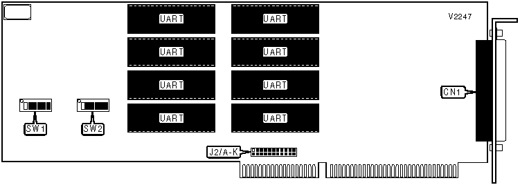 Note: A total of 1024 base address settings are available. The switches are a binary representation of the decimal memory addresses. SW1/1 is the Most Significant Bit and switch SW2/4 is the Least Significant Bit. The switches have the following decimal values: SW1/1=32768, SW1/2=16384, SW1/3=8192, SW1/4=4096, SW1/5=2048, SW1/6=1024, SW2/1=512, SW2/2=256, SW2/3=128, SW2/4=64. Turn off the switches and add the values of the switches that are off to obtain the correct memory address. (Off=1, On=0) Each port takes an additional 8 bytes after this address, for a total of 64 bytes. | ||||||