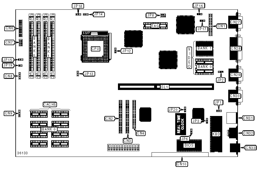 bus mouse port, Ethernet 10BaseT connector, floppy drive interface, green PC connector, IDE interfaces (2), parallel port, PS/2 mouse interface, PS/2 keyboard interface, serial ports (2), VGA feature connector, VGA port, riser slot |