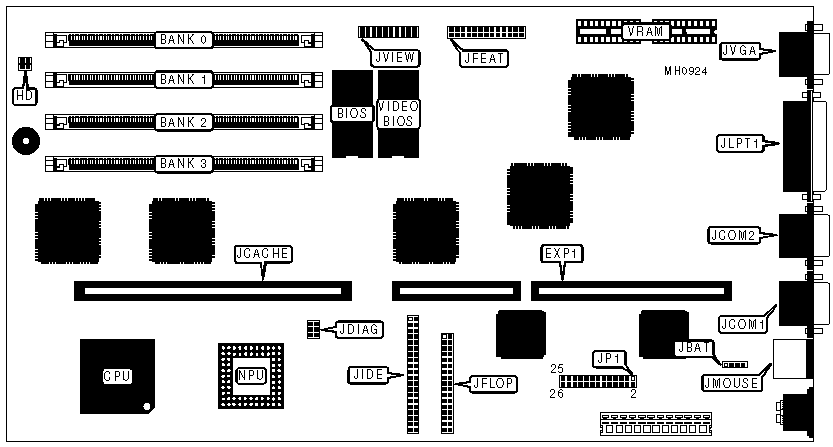 Bus mouse, cache card/shunt card slot, floppy interface, IDE interface, parallel port, riser card slot, serial ports (2), VGA port |