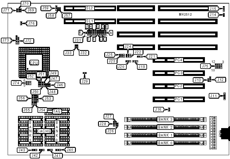 32-bit VESA local bus slots (2), 32-bit PCI slots (4), green PC connector |