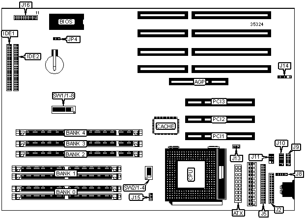 32-bit PCI slots (3), floppy drive interface, IDE interface (2), parallel port, PS/2 mouse port, serial ports (2), IR connector, AGP slot, USB connector