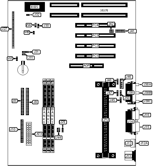 32-bit PCI slots (4), floppy drive interface, game/MIDI port, IDE interfaces (2), parallel port, PS/2 mouse port, serial ports (2), USB connectors (2), ATX power connector, AGP slot, line in, line out, microphone in, audio in CD-ROM |