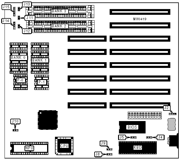 Notes:Locations of Bank 0, Bank 1, P0, & P1 unidentified. Bank 0 consists of U26, U27, U31, & U32. Bank 1 consists of U35, U36, U37, & U38. P-0 consists of U41 & U42. P-1 consists of U43 & U44. | ||||||