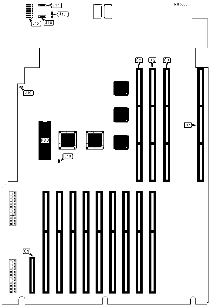 Proprietary external CPU/cache card connector, proprietary external keyboard/mouse connector, proprietary external memory card connectors (2), proprietary external local bus connector |