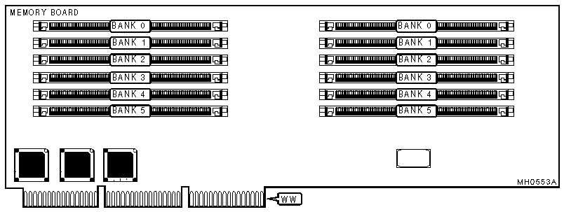 Note:Table is shown for the easiest possible DRAM configuration. You can configure any of the six banks on one memory board with any type and combination of 36 bit SIMMs as long as the same type of SIMM populates a bank. | ||||||
